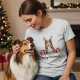 "This beautiful and striking design features a stunning portrait of a Collie dog (أو Sheltie) with its magnificent long fur and intelligent, gentle eyes. The dog is given a festive touch with reindeer antlers adorned with small bells. Two beautifully wrapped pink and red Christmas gifts flank the dog. This high-quality graphic is ideal for personalized holiday gifts, pet owner apparel, Christmas cards, ornaments, or fine art prints."