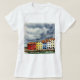 Above the houses is a stormy, gray sky, creating a dramatic contrast between the gloomy weather and the brightly lit facades of the houses.
