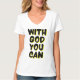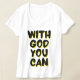 Esta design de camiseta de v-pescoço feminina tem as palavras "Com Deus Você Pode" em um estilo de bolha impressão mais letras negras e contornos de sombra amarela com um estilo de tipografia neste tema baseado na fé. Esta tenda é contorcida e colocada lado a lado para uma feminina feita com tecido leve de conforto.
