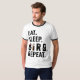 Pássaros, observadores de pássaros, ornitólogos e amantes da natureza amarão esta camiseta gráfica branca moderna com um colar preto que celebra seu passatempo favorito com o ditado "Coma. Durma. Pássaro. Repita." Quer sejam hobbistas que apreciem os pássaros em seus quintais, ou um fotógrafo de vida selvagem sério que adora documentar as vidas interessantes desses belos passarinhos, eles vão amar as pássaros bonitinhos espiando pelas cartas na frente. Um cardeal vermelho brilhante, uma pomba macia, um pica-pau descendente adorável, e um pica-pau azul impressionante fazem a sua aparência nesta camisa, tal como frequentemente gostam de visitar os nossos pátios! No verso, o ditado é repetido, e você pode escolher mantê-lo ou personalizar o texto com o nome do seu passarinho favorito, um clube de pássaros ao qual pertence, ou outro passarinho divertido dizendo que você ama. Também no verso, você encontrará uma foto de cheio de uma pomba dopadora! Adorei pássaros há anos, e gosto de fotografar os visitantes dos meus alimentadores de quintal, assim como outros que encontro em parques locais. Espero que goste desta design! Fotos e design por Amanda Renee, Designs digitais CtrlZ