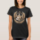 design de camiseta com a imagem de uma insígnia militar de um comandante de café, com uma xícara de café a vapor com asas de ornamentado e estrelas à sua volta.