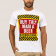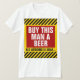 Comprar a este homem uma camiseta de solteiro de cerveja. Avisando listras amarelas pretas com um grande texto branco personalizável "Comprar Este Homem A Cerveja" sobre fundo vermelho e texto preto "Seu casamento está perto". Esta despedida de solteiro de atenção do excelente é totalmente personalizável, adicione seus textos e imagens!