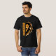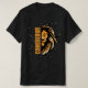 Camiseta preta colorida, de homem, impressa com o texto "Conquistador" e gráficos.