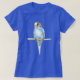 Um desenho de aquarela de um orçamento branco e azul. O pássaro está sentado sobre um pau e olha para você com um rosto bonito. Você vê o periquito da frente.