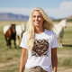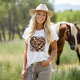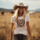 Camiseta Coração de Country e Western. © Camisetas & Suéteres na Zazzle. Esta camiseta tem um design de coração que inclui cavalos, cavalgada, um pistão, chapéu de cowboy, estrela de xerife e um touro de chifres longos e outros motivos de cavalgada.