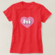 Esta t-shirt tem um coração cor-de-rosa vibrante contendo as letras hi, maiúsculas, brancas e redondas, negros, uma abreviação lúdica para o estado do Havaí, o estado de aloha.