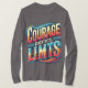 Esta longa design de camiseta de manga mostra a frase motivacional "Coragem desafia limites" em caracteres negros e multicoloridos. Cada letra é dinâmica e levemente robusta, dando ao texto uma sensação texturizada e resiliente. As cores vibrantes pop contra um fundo limpo e sólido, reforçado por um gradiente sutil que cria um efeito brilho em torno da frase. Este design irradia o empoderamento e a positividade, fazer-o perfeito para qualquer um que queira vestir a inspiração orgulhosamente.