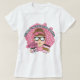 Camiseta design cristã de uma mulher bonita com uma senhora segurando um buquê de flores cor-de-rosa e uma xícara de café. Texto diz: "Correndo em Jesus e café." "
