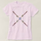 Corrente de cobre com miçangas verdes amarelas em ambos os lados de um talão azul com flor branca e rosa. As cadeiras são cruzadas em um X.
