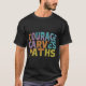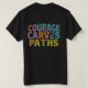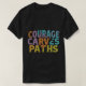 A design da camiseta apresenta a frase "Courage Carves Paths" em caracteres negros e multicoloridos. As cores vibrantes e a fonte dinâmica criam uma afirmação visualmente impressionante e inspiradora. O design transmite uma mensagem de perseverança, determinação e o poder da coragem para superar desafios e criar novas oportunidades.