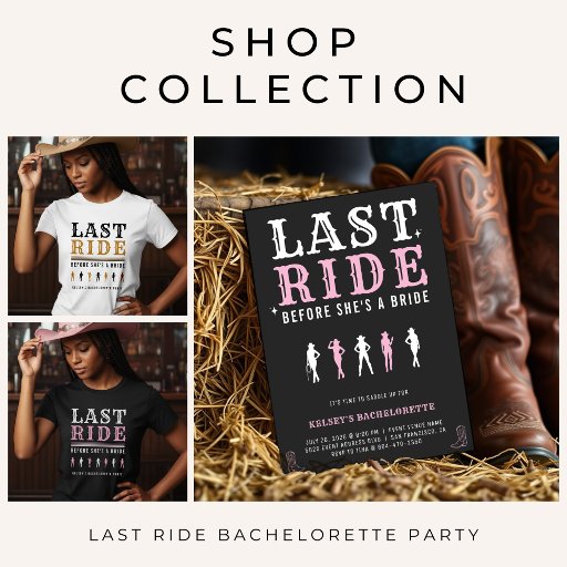 Celebrate the bride's last ride with this western cowgirl themed bachelorette party shirt. Featuring cool saloon styled text, and a brown, black and white color palette, it's a fun choice for a girl's night out or bachelorette weekend. Personalize it with the bride's name and event details for a custom keepsake!