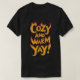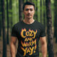 Uma ilustração digital com o texto Cozy And Warm Yay! escrito em letras amarelas e vermelhas em forma de chama sobre fundo preto.