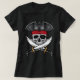 Um crânio ameaçador, adornado com um chapéu de pirata clássico e um telhado ocular, é destacado no centro da imagem. As tomadas oculares vazias do crânio se fixam com uma intensidade sinistra, enquanto os dentes estão queimados num resfriado. Duas espadas cruzadas, ou espadas piratas, flanquearam o crânio, aumentando a sensação geral de perigo e agressão. O design é renderizado em um estilo gráfico em negrito com contrastes em preto e branco.