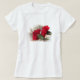 Esta incrível camiseta de espaguete de espaguete apresenta dois brilhantes cravos vermelhos em um fundo de tecido de brocado branco-pérola.