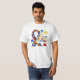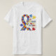 Uma parte do quebra-cabeça que me leia 'ama uma criança com autismo", partes do quebra-cabeça de azul, de vermelho, e amarelo e a fita da consciência do autismo em t-shirt da consciência do autismo, em hoodies, em canecas, em ímãs, em cartões, em etiquetas, em bolsas, em chaveiro, em botões, e em outros artigos.