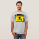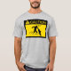 Sinal de precaução amarelo e preto com um peixe tentando comer uma figura de palito.