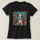 Arte aérea branca adorável com um cachorrinho castanho e branco rodeado por flores de arte folclórica, cor-de-rosa, laranja e roxo.