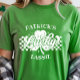 Custom Girlfriend's Name St Patrick's Day Lucky T-Shirt. Celebrate St. Patrick's Day in style with this custom "Lucky Lassie" t-shirt design! Featuring a distressed clover graphic with your custom boyfriend or husband's name in a vintage, playful font, this shirt is perfect for anyone who feels extra lucky on March 17th. The checkered pattern on the sides adds a unique touch, making it a standout choice for the bar, pub, parades, parties, or just a casual day out. Show off your Irish spirit and your pride in your man with this charming and eye-catching design. It's a fantastic way to embrace the festive atmosphere and spread some cheer.