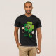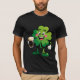 A bright green four-leaf clover motif beams with happy eyes and rosy cheeks, tipping a jaunty green hat while raising a frothy pint. Bold vector lines, rich greens, and yellow shoes create a festive, playful St. Patrick’s Day vibe.