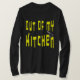 Fora da minha cozinha dizendo para cozinheiros com atitude, mães com Momitude e aqueles que se escravizam sobre um fogão quente por toda parte. Slogan de comida divertida em letras riscadas vermelhas no sangue com um decote de carne no 'N'
