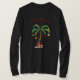 Camisa de manga comprida para senhoras mostrada em preto com um impressão de palmeira festivo com texto de Feliz Navidad. Perfeito para os feriados. Personalize este item ou comprar como está.