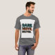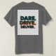 O design de t-shirt contém a frase "Dare, Drive, Deliver" impressa em letras grandes e em negrito na parte frontal. As letras têm uma estética vintage angustiada, dando ao design um olhar robusto e sujo. A frase é impressa em cor escura em uma camisa de cor clara, fazer fácil de ler. A design é simples e atenta aos olhos, e é certo que faz uma declaração.