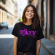 Esta camiseta diz Picante em letras rosa brilhante com estilo grunge.