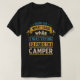 Este design apresenta uma camiseta preta com o texto "DESCULPE PELO QUE EU DISSE" em azul e amarelo, acima de "while" em branco. Abaixo de "while" está "I WAS TRYING" em azul, acima de "TO PARK THE" em amarelo, e "CAMPER" em uma fonte grande e amarela clara. O texto é arranjado dentro de faixas decorativas e formas de caixa.