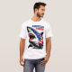 Esta imagem mostra um tubarão feroz com a boca bem aberta, exibindo dentes agudos. O corpo do tubarão é decorado com elementos da bandeira americana, incluindo estrelas e listras vermelhas e brancas. Acima do tubarão, as palavras "PODER AMERICANO" são escritas em caracteres azuis e vermelhos. Esta design aparece em uma camiseta branca.
