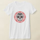 Minha versão de um crânio de açúcar único em branco, vermelho e preto com muitos sotaques elegantes em um fundo de coordenação. Mostrado aqui em uma camisa.