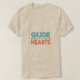A design da camiseta apresenta a frase "Glide into Hearts" em uma cascata de cores vibrantes. Cada palavra flui graciosamente através da camisa, com diferentes letras se gabando de matizes únicas e que chamam a atenção. Isso cria um olhar dinâmico e estimulante, perfeito para espalhar uma mensagem de conexão e charme.