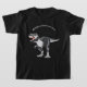 A camiseta deste rapaz apresenta um temível Dinossauro T Rex preto e branco sobre fundo preto.
