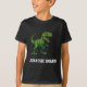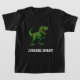 Para uma t-shirt preta/escura. Uma imagem de um Tyrannosaurus Rex com a citação: Jurassic Smart! Texto branco.