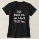 A despedida de solteira dela vai se destacar nessa camiseta engraçada da JessicaAmber. Essa camiseta fofa apresenta a frase engraçada 'Eu gosto de mim bêbada, mas não confio nela.' Você pode editar essa frase conforme necessário. Para mais suprimentos para despedida de solteira, visite minha loja Zazzle.com/DriftwoodAndDreams ••• Para pedidos personalizados, me envie uma mensagem no Zazzle