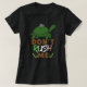 The central message "DON'T RUSH ME" is stacked in three lines. "DON'T" and "ME" are rendered in a solid, earthy brown block font. The word "RUSH" is the focal point, featuring a dynamic green-to-brown color gradient and a textured, brush-stroke effect that contrasts with the clean lines of the animals.