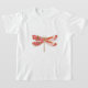 Articulado artificialmente, ouro, libélula joalhada com vermelho e asas decoradas com cereja japonesa vermelha, florescente e joalhada sobre fundo branco. Dourada Dragonfly.