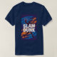 Um design de camiseta de basquete vibrante com um jogador de basquete 3D dinâmico, mergulhando a bola em um aro. A silhueta do jogador é colocada sobre um fundo de giro, abstrato cores em tons de azul, laranja e roxo. As palavras "Slam Dunk" são corajosamente impressas no peito, criando uma sensação de intensidade e energia. O design geral é moderno, atraente e perfeito para os entusiastas do basquete.