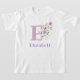 Nome & inicial com Design Floral em uma t-shirt. Design apresenta o Monograma & Nome do destinatário com Flores no estilo de pastel de cor de água. Inicial é a letra E. Exemplo mostra Elizabeth. Design Floral.