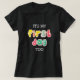 Divertido É minha primeira camiseta também para Mães do jardim de infância que estão se ajustando às suas pequenas que vão ao jardim de infância pela primeira vez. Esta camiseta vai guardar as lágrimas? Provavelmente não, mas você pode olhar na moda à medida que se junta às outras mães chorando (e pais?) nos portões da escola. Design mostra tipografia de bolhas divertida em várias cores. Comprar para dar como presentes a outras Mães do "Primeiro Dia Também". Também bom para voltar à escola.