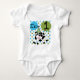 T-shirt, bodysuits, cartões, etiquetas, ímãs, e mais do design do primeiro aniversario da vaca com os balões e as bolinhas azuis e verdes, excelente para alguma criança que amar vacas e animais de fazenda e está comemorando seu primeiro aniversario!