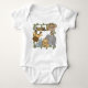 T-shirt dos animais da selva do bebê, canecas, bodysuits, cartões, etiquetas, sacolas, e outros roupa e presentes animais da selva que caracterizam um macaco, um elefante, um girafa, um leão, e um hipopótamo.