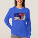 Uma águia careca varreu o céu de sua perca em um galho de árvore; sobreposto a uma bandeira dos Estados Unidos.