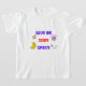 Esta camiseta apresenta um design ousado e colorido com a frase "DÊ-ME ALGUM ESPAÇO". A design inclui imagens espaciais como foguetes, planetas, capacete de astronauta e estrelas. O tema da design é lúdico e foca-se na exploração espacial e astronomia.