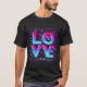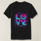 Um design LOVE de inspiração cibernética com um efeito reluzente em azul elétrico e magenta, tremendo como uma tela de TV da velha escola. Uma estética digital futurista para amantes tecnológicos e ciberpunk.