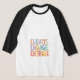 Um design de camiseta vibrante com as palavras "Elevate, Engage, Enthuse" em um estilo divertido e escrito à mão. Cada letra é uma cor clara diferente, criando uma vibração divertida e enérgica. O design é colocado sobre um plano de fundo, permitindo que o texto fique no centro do palco.