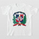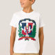 Casaco de armas da República Dominicana A casaco de braços da República Dominicana apresenta um escudo em cores igualmente quartejadas como a bandeira, apoiada por um galho da baía (esquerda) e um muro da palma (direita); acima do escudo, uma fita azul exibe o lema nacional: Dios, Patria, Libertad (Deus, Pátria, Liberdade). Abaixo do escudo, as palavras República Dominicana aparecem em uma fita vermelha. No centro do escudo, flanqueado por seis lanças (três de cada lado), as quatro dianteiras segurando bandeiras dominicanas, é uma Bíblia com uma pequena cruz ouro acima dela, que é aberta (de acordo com a crença popular) ao Evangelho de João, às 8:32, que lê Y la verdad os hará libre (e a verdade o fará livre). O casaco de armas aparece no centro da bandeira da República Dominicana.