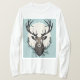 Ilustração estilizada de uma cabeça de cervo com grandes galhadas, sobreposta em um pano de fundo circular sugerindo uma cena de floresta. Possui um design gráfico moderno.
