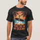 Esta camiseta preta mostra um gráfico de um esqueleto vestindo um chapéu e carregando um prato de surfe em uma praia. Palmeiras, um pôr do sol sobre o oceano, e o texto "ENCONTRAR-ME NO OCEANO" em laranja completam a design. Sugere uma tomada humorística aproveitando a vida após a morte na praia.