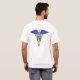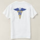 Este Caduco Enfermeiro apresenta cobras ouros gêmeos em torno de um funcionarios azul claro com asas azuis mais profundas e a letra N. Texto na camisa diz Enfermeiras Rock.