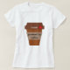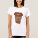 Esta camisa exibe uma xícara de café marrom com o texto "enfermeira - movida a café." Há uma cruz vermelha ao lado de "enfermeira".
